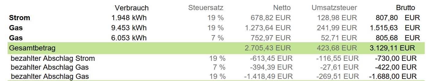 Dann sehen Sie, ob Sie Geld zurückbekommen, weil Sie Energie gespart oder von vornherein einen höheren monatlichen Abschlag gewählt haben oder, ob Sie eine Nachzahlung auf Ihrer Rechnung finden.